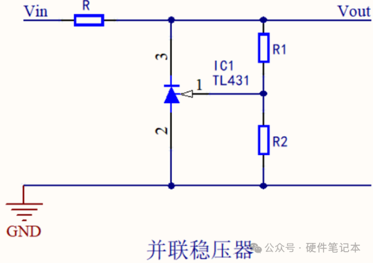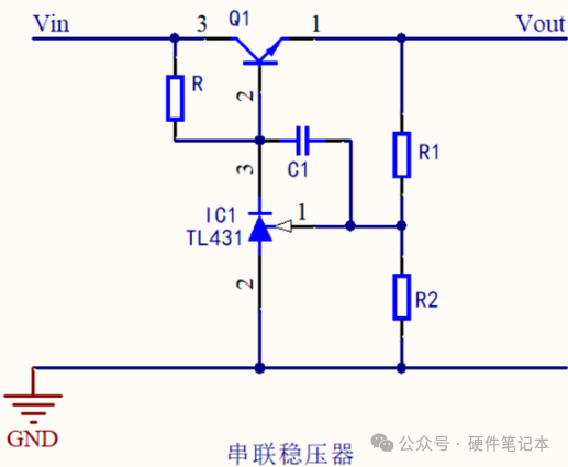 串联稳压器可以说是并联稳压器的扩充,但是电流可以输出很大(如果用大电流的复合管),但是输出电压公式一样的,Vout=(1+R1/R2)Vref,注意输出最小值Vout(min)=Vref+Vbe。