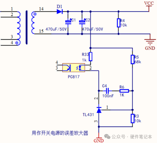 在开关电源当中我们经常看见这样的反馈电路,以TL431构成误差放大器,以光耦进行原副边隔离的电路结构。R3和R5决定输出电压大小,C4和R6构成补偿网络。当输出电压有变化,最终导致光耦输入端二极管电流变化,从而控制电源芯片开关管通断频率,使输出电压保持不变。