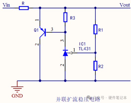 并联扩流稳压电路是在基本的并联稳压电路基础上修改而来,通过增加三极管,三极管的发射极连接到输出电压端,利用三极管的放大状态,使其具有扩流作用。