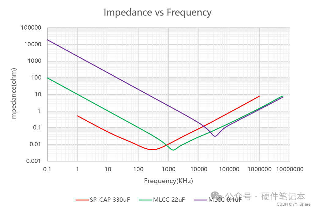理论上容值越大,效果越好,但是不同的电容,对于相同频率的阻抗是不一样的,如下图。电容一般选择混搭的方式,即大容值的固态电解电容跟小容值的MLCC组合,以实现全频段都有较低的阻抗。