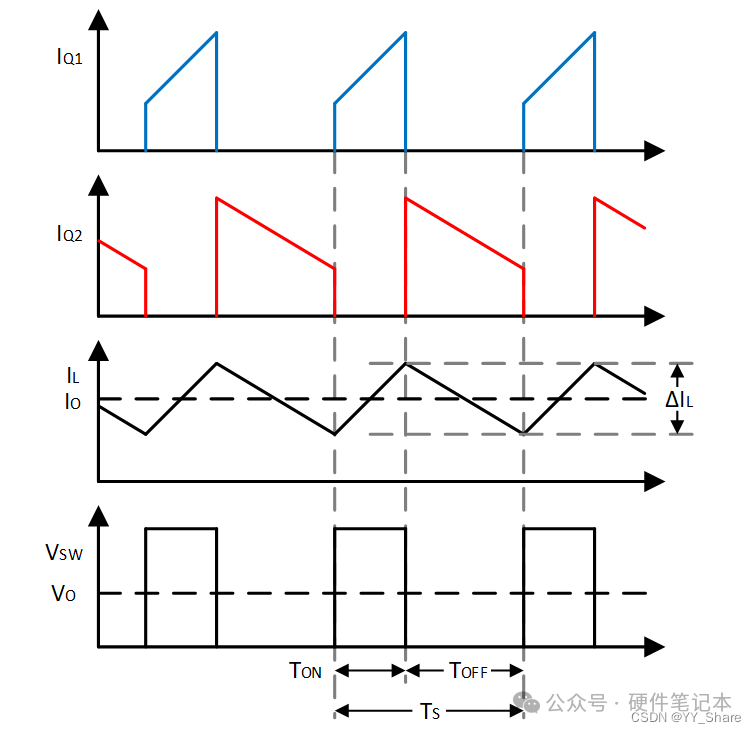 a、当Q1打开,Q2关闭,Vsw为高,IQ1增加,IQ2为零,电感电流增加。