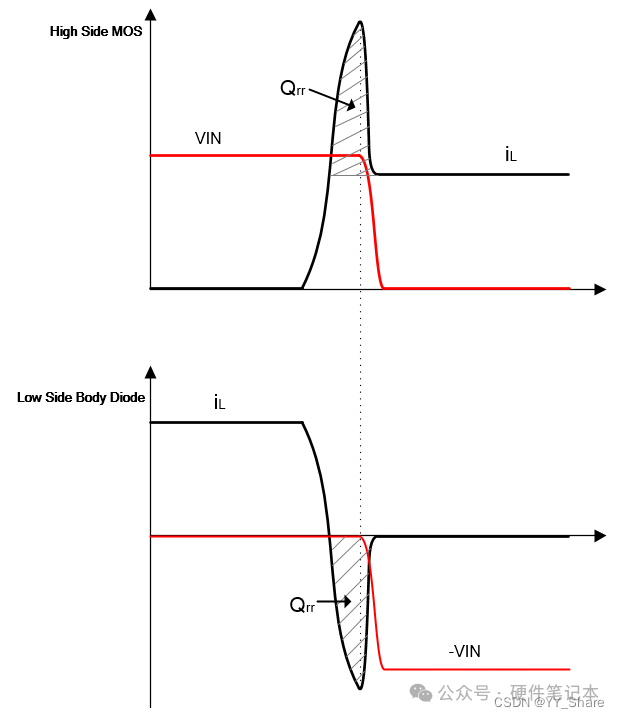 为了不让上下MOS出现同时导通,将VCC短路到地的情况,两个MOS开关之间存在dead time,下管关闭然后经过dead time的时间,再去打开上管。此时下管的体二极管在dead time时间内续流产生的损耗以及反向恢复时产生的损耗。