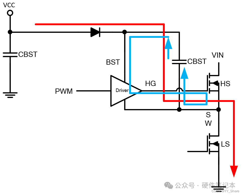 1、初始状态,LS导通,HS关闭(HS的 PWM输入为低),SW电压为0V,VCC通过二极管对CBST充电至VCC电压(红色路径)。