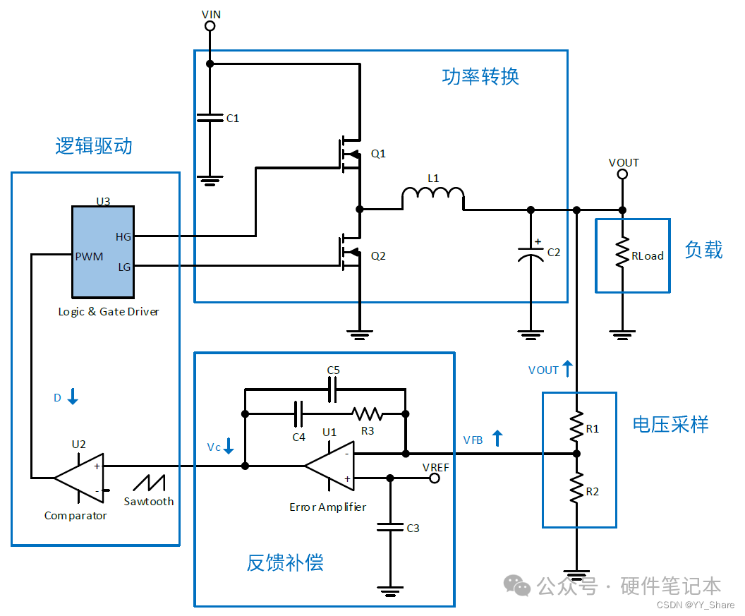 按照功能,分为逻辑驱动、功率转换、负载、电压采样和反馈补偿。