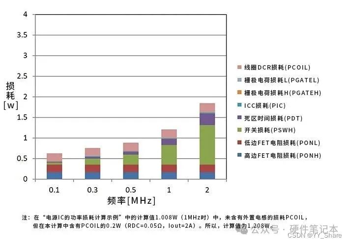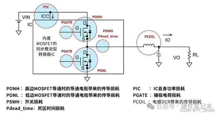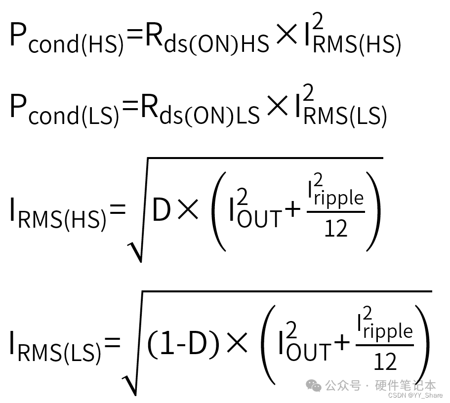 这里需要注意,在稳态连续导通模式的时候,电感充电流和放电流的量是一样的,所以上下管的通过电流一样,所以HS和LS导通损耗比跟PWM的占空比有关。如果占空比D为百分之五十,可以认为上下管的导通损耗一样。