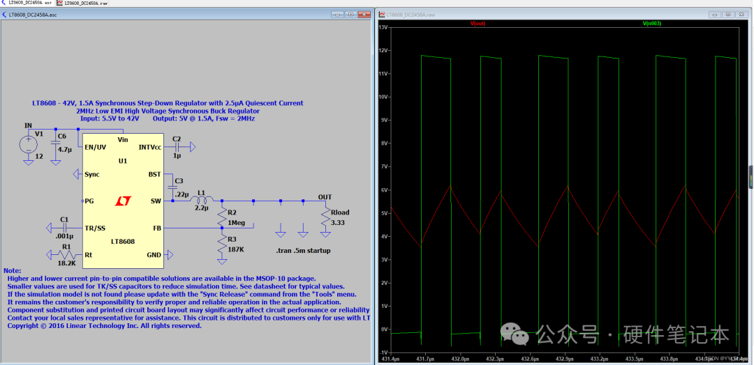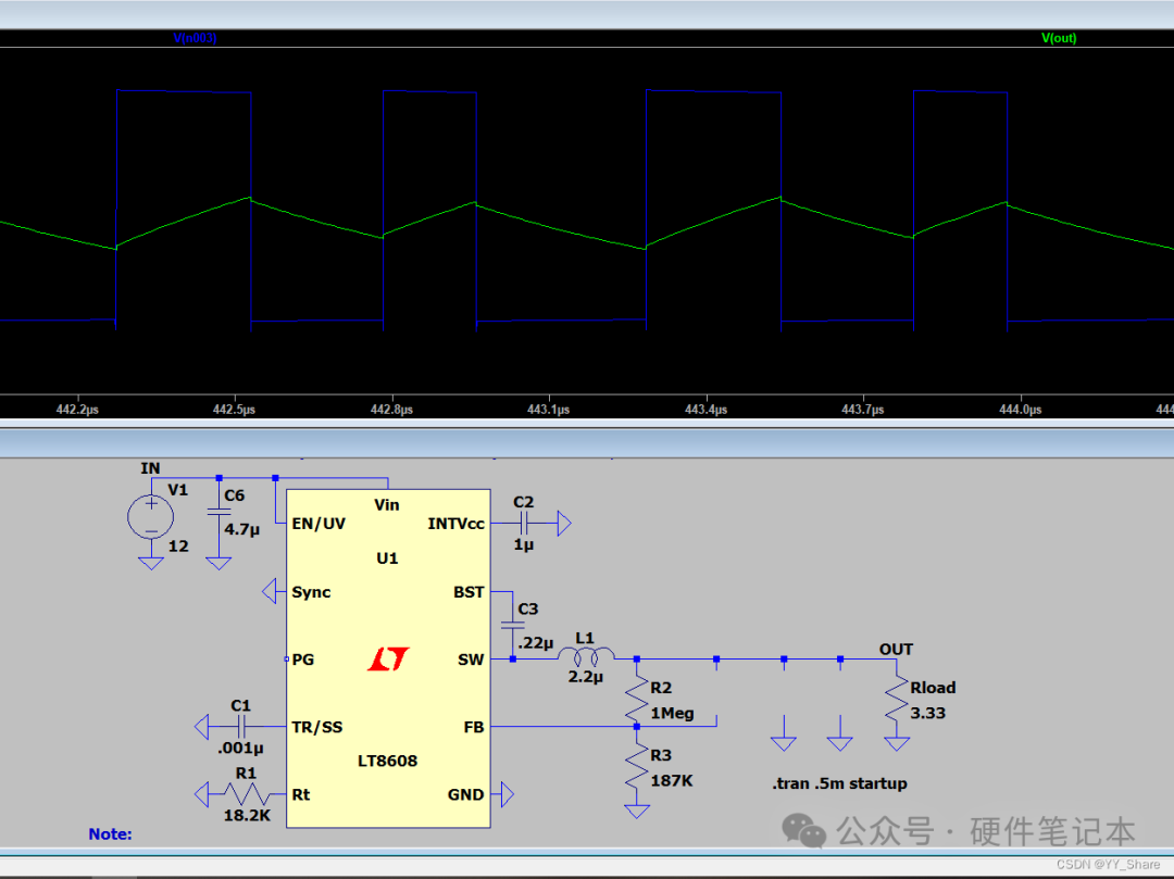 这里放一个有意思的仿真波形,绿色为电感左端SW电压信号,红色为输出电压信号。