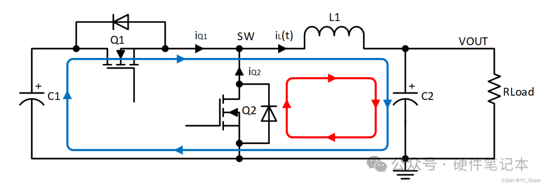 1、当Q1导通,Q2关闭,SW端电压为输入电压VIN,VIN给电感L1充电,电感电流增加,VIN=VL+VOUT,此时电感电压左正右负。电流方向为图示蓝色回路。
