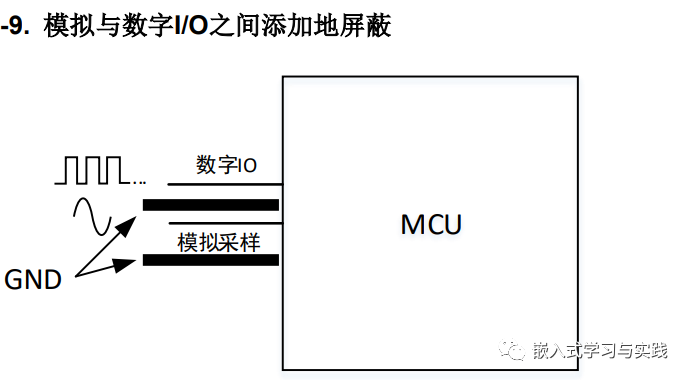 有几种实践方法可以尝试来减弱 IO 之间串扰对 ADC 采样的影响,首先,在引脚规划上,就需要提前规划将那些需要持续翻转的数字 I/O 在物理位置上远离 ADC 采样通道;如果由于资源限制,频繁翻转的数字 I/O 无法远离模拟采样口,我们可以在后期 layout 上采取一些措施来弱影响,比如我们可以通过在数字 I/O 与模拟通道之间加上一定面积的 GND 来隔离。当然,由于包地屏蔽无法覆盖芯片内部,bonding 线之间的串扰仍会继续存在。此外,减慢数字信号的边沿也会减弱串扰的影响,如对数字信号添加电容值适当的电容,减慢 MCU 数字 IO 口的驱动速度,也能显著减慢这个数字信号边沿。软件层面,我们同样有一些尝试,比如在数字 I/O 口不翻转的时候进行一次 ADC 转换,当然前提是应用允许这么做。
