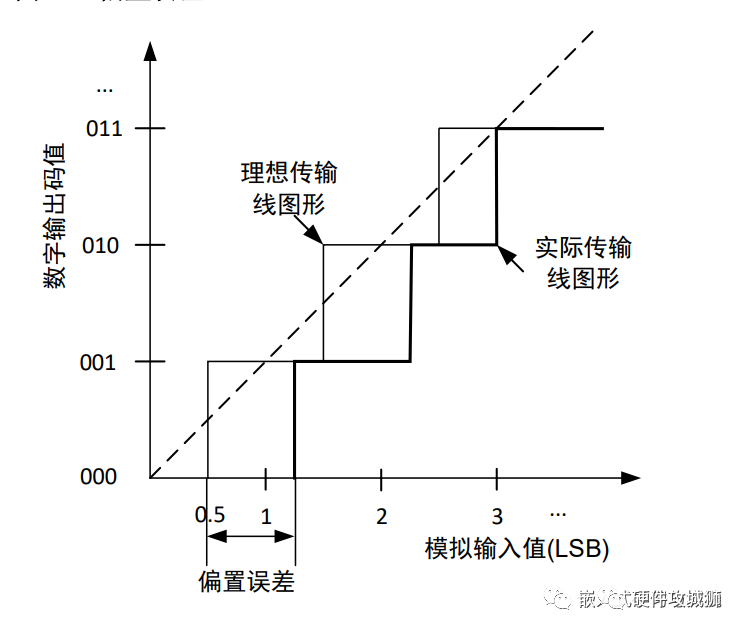 偏置误差(Offset error) :ADC 的偏置误差定义为第一个码字转换(从 0x00 到 0x01)所对应的实际电压偏离理想电压 位置的差值。
