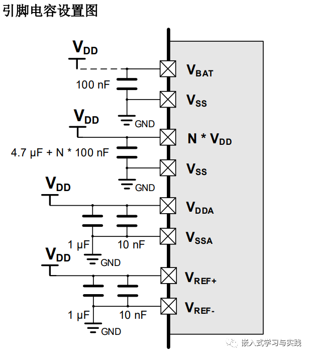 系统的硬件解耦对于采样精度提高尤为重要,在 MCU 端,对于模拟电源引脚,建议就近放置一个 1uF 与一个 10nF 的陶瓷电容(ESR 较低)。对于其他的数字电源 VDD 引脚,就近放置一个 100nF 的陶瓷电容。对于MCU 接地引脚,建议将模拟地与数字地采用 0 欧姆电阻或者磁珠连接,以屏蔽数字地对于模拟地的干扰。