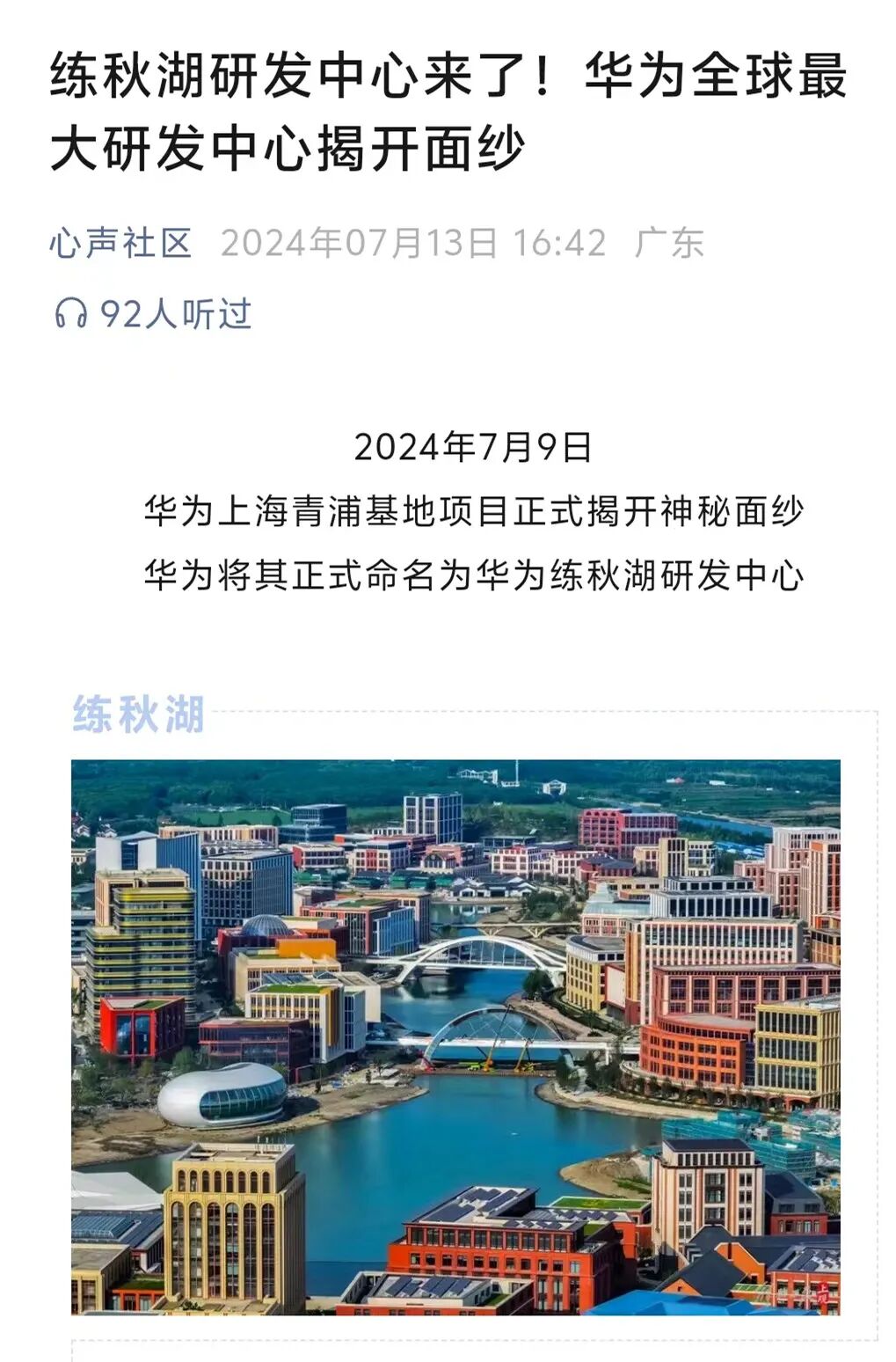 据悉,该项目是上海市重点工程,也是长三角一体化示范区西岑科创中心的亮点项目。“练秋湖研发中心”的建成和启用,不仅标志着华为在科研领域迈出了坚实的一步,更预示着长三角地区乃至全国的科技创新将迎来新的高 潮。