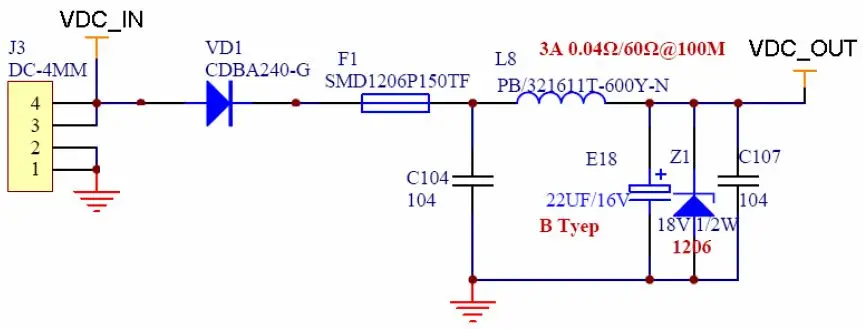 J3 是输入插座,用于连接输入电源。VD1 是防止反接的二极管,要选反向击穿电压大,正向导通电流大,导通压降小的整流二极管,比如肖特基势垒整流二极管。F1 是限流的保险丝,最好选择有可恢复的,比如自恢复PTC 保险丝。C104、C107 是0.1uF 的滤波电容,和L8 一起组成一个π型滤波电路,滤除高频噪声。L8 是60Ω@100MHz 的磁珠,用于滤除高频干扰,同时起到一定的限流作用。E18 是22uF 的B 型钽电容,用于滤除电源中的低频噪声。Z1 是18V/0.5W 的稳压二极管,防止输出电压大于18V。 Z1 不能放在F1 之前,因为大多数稳压二极管失效之后是短路状态,这样输入电压VDC_IN 经过VD1 被短路到地,没有起到保护输入电压的作用。