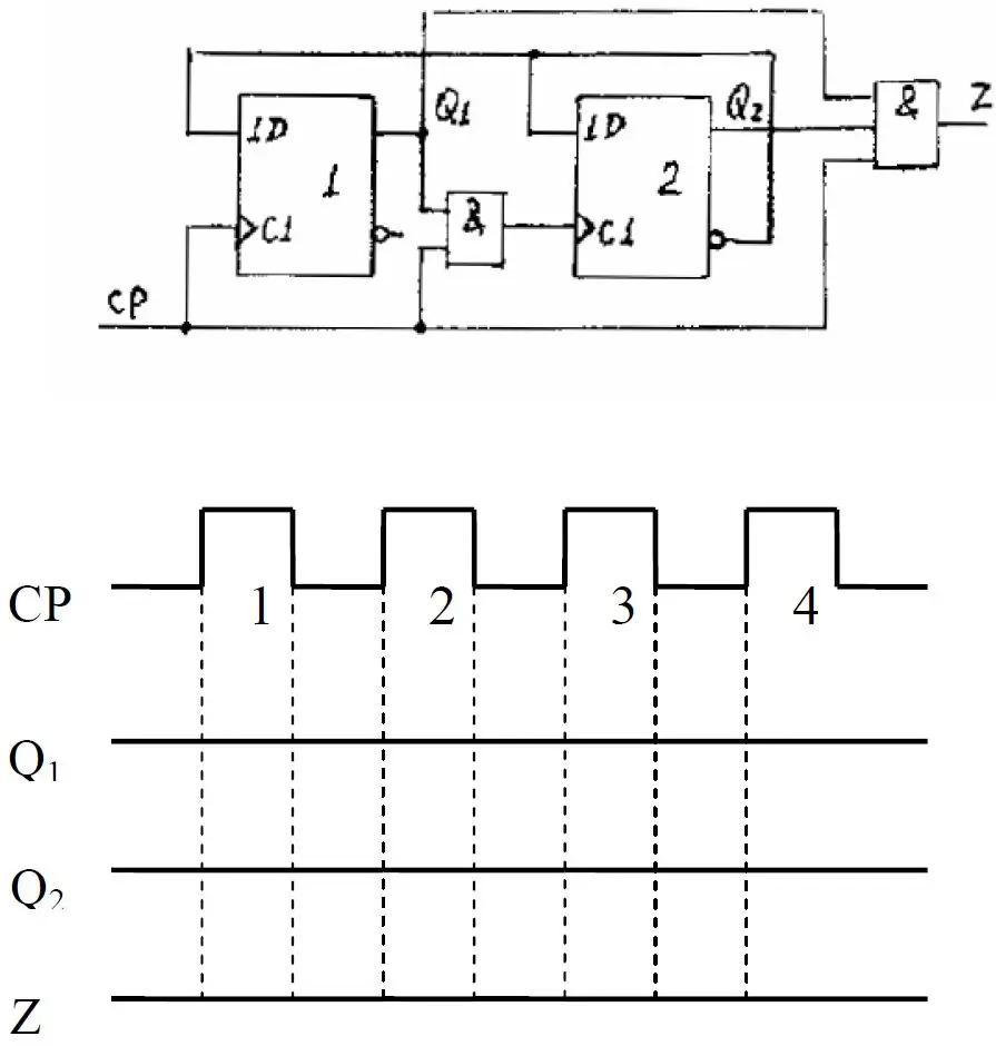 96分析下列时序电路,画出连续4 个CP 脉冲作用下,Q1,Q2,Z 的输出波形,说明是几进制计数器,有否自启动功能。