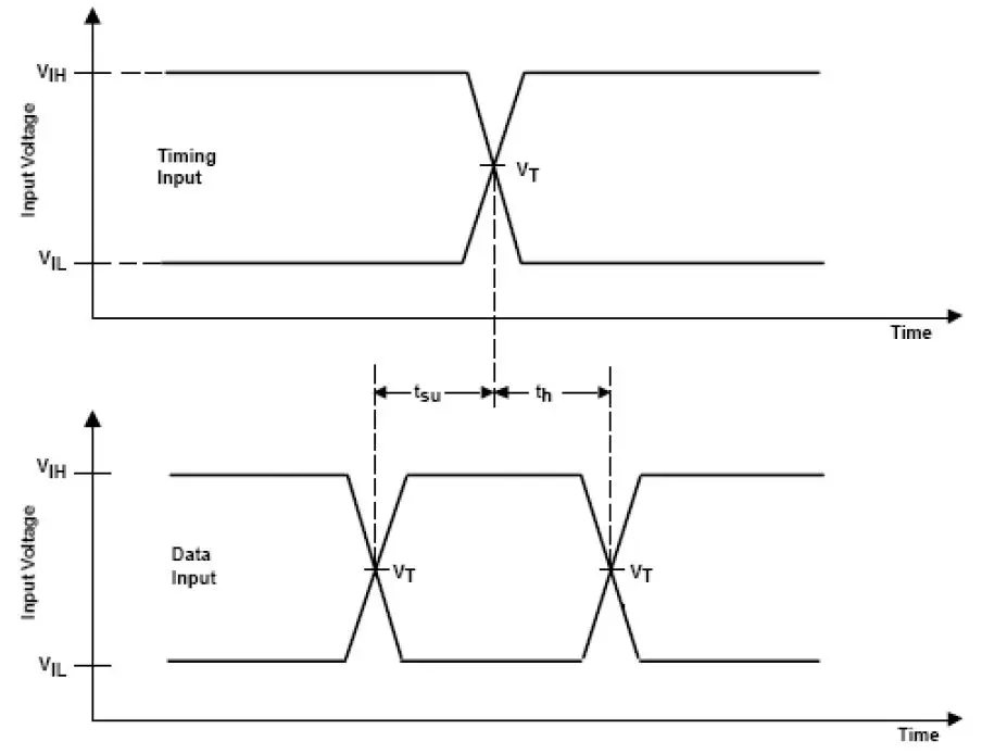 Setup-Time 和Hold-Time 是芯片对输入信号和参考时钟信号之间的时间要求。Setup-Time 是指参考时钟沿到来之前输入信号保持稳定不变的时间,Hold-Time 是指参考时钟沿过后输入信号保持稳定不变的时间。如果信号的 Setup-Time 和Hold-Time不满足要求,输入信号将不能打入触发器。如果输入信号在参考时钟沿前后稳定的时间均超过Setup-Time 和Hold-Time,那么超过量就分别被称为Setup-Time 裕量和Hold-Time 裕量。如下图,tsu 为Setup-Time,th 为Hold-Time: