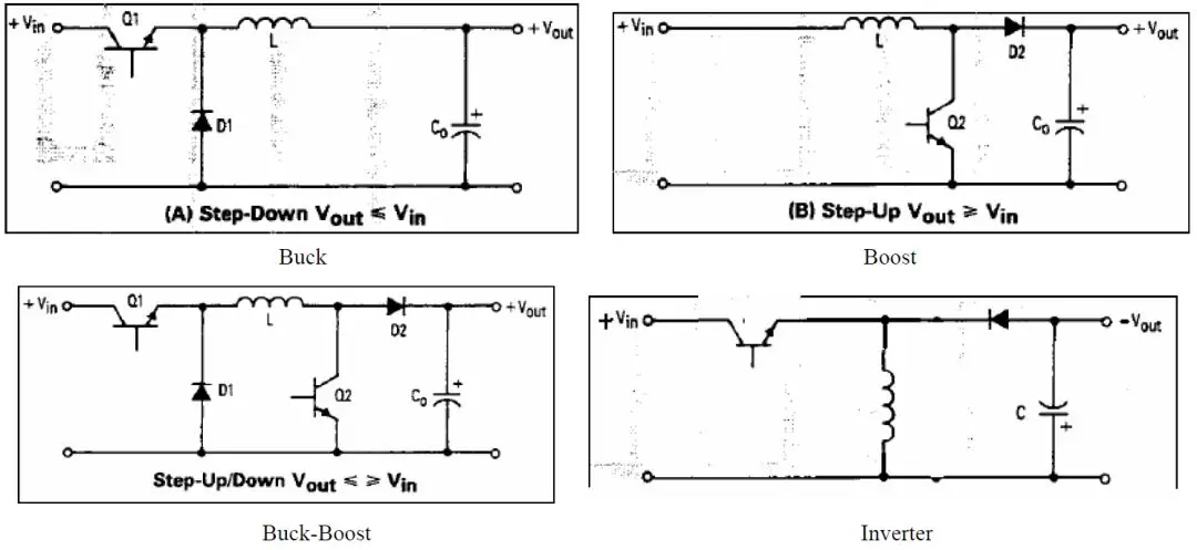 93请画出DC-DC 电路的四种电路简图(Buck、Boost、Buck-Boost 和Inverter)。