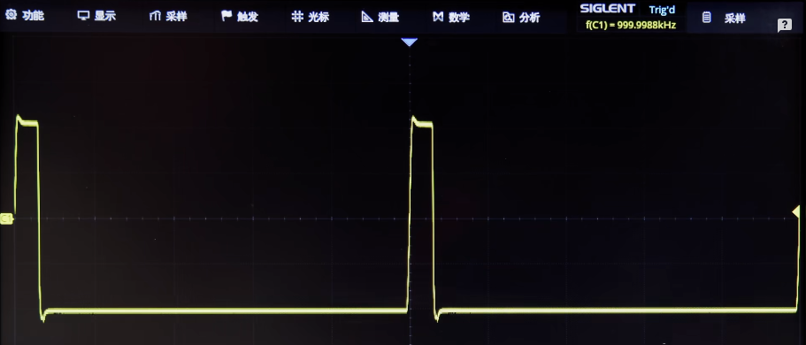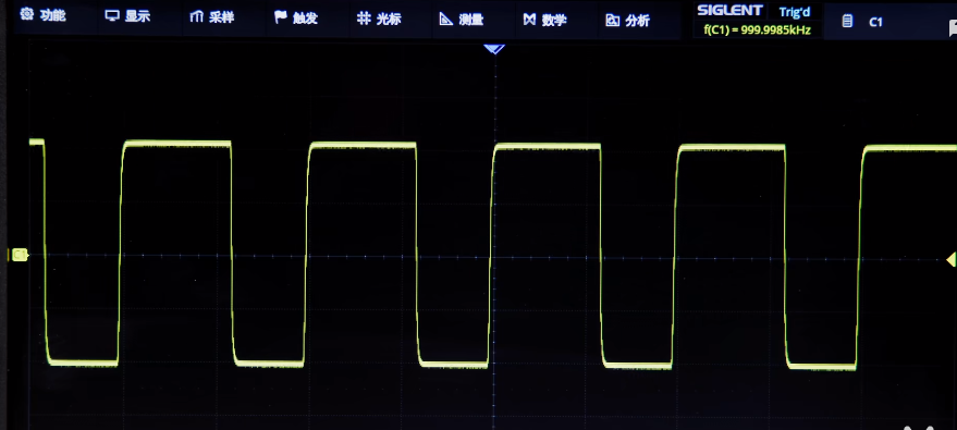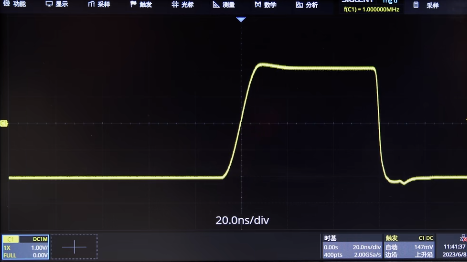 首先我们设置一个方波,将它的频率设置为1MHz,脉宽为600ns,上升时间为10ns,然后输出信号,现在示波器所显示的是较为理想的方波。