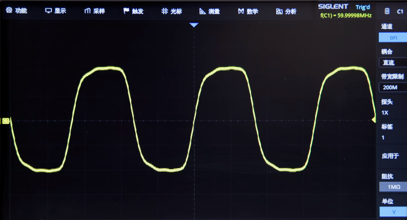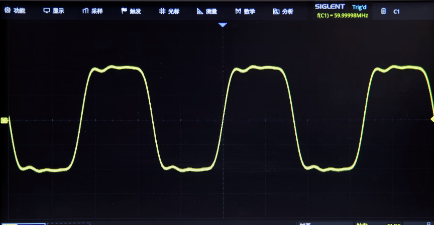 使用一台带宽为500MHz的SDS2000X Plus数字示波器以及SDG6000X任意波形发生器,首先发出一个频率为60MHz的方波,可以看到此时的波形虽然棱角不够分明,但也能看出是个方波。