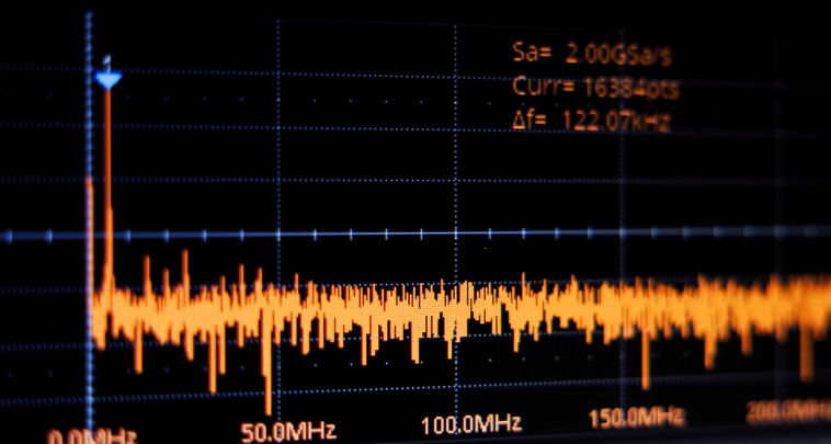 此时,我们直接将输出的正弦波换成方波,从它的FFT频谱图可以看到有很多个峰值点,峰值分别处于5MHz, 15MHz, 25MHz……其实这就是我们刚才所说的基波、三次谐波、五次谐波等。