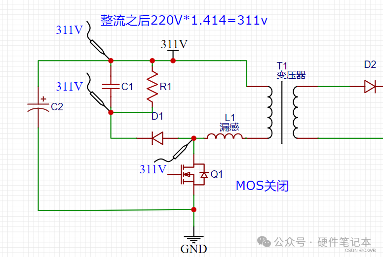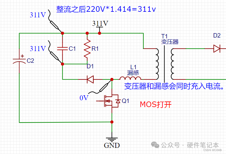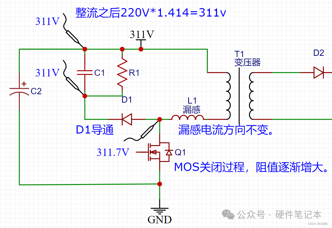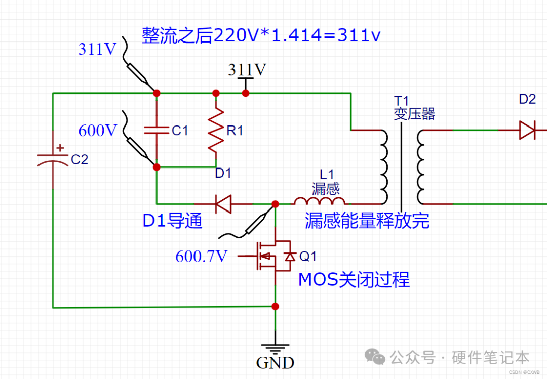 上图里面没有讲到的一个是D1、C2、R1组成的东西。RCD的出现是为了解决原边MOS关闭的时候漏感能量造成原边MOS应力过高的问题,这句话我慢慢解释。1、现实变压器不是理想的,像98折的充值活动一样,原边绕组(原边线圈)充了100块钱,但是到副边只剩98块钱了,中介吞了2块钱。这中介便是漏感,漏感通俗的定义是无法耦合到副边的感量。顾名思义,测量也非常简单,通过短路输入绕组,再测量原边的感量,由于输入绕组短路,磁芯磁路被短路,耦合到副边的能量都被短路了,还能测量出来的便是漏感。如下图表示:2、漏感存在又会造成什么问题呢,好问题,给提出这个问题的小朋友点赞。As we all know 原边的MOS开通的时候,会给原边的电感充入100块钱的电流,那你猜一下,100块钱原边电感能全部得到吗?显然不能,因为漏感和原边的电感时串联关系,会根据他们的感量来分配着100块钱,假如漏感分到了2块钱,而漏感的定义是无法耦合到副边的感量那这两块钱又该用在什么地方呢。 As we all know 电感的电流不能突变,假如mos关断的一刻,漏感上的电流已经达到1A,那MOS关断的时候,MOS阻抗近似无穷大,假设10兆欧姆吧,1A电流不能突变,回路已经形成了10兆欧姆的阻抗,那电压是多少呢?显而易见是1A*10兆欧=10兆伏=10 000 000V,一般MOS耐压多少V呢,650V?700V?这时候MOS是不是会承受一个10兆伏的电压,MOS可抗不住,直接躺平,boom的一声,然后同事就围上来:“哟,这次怎么没有上次响呢?”3、既然出现了问题,那就有解决问题的方案,那就是RCD电路:上面第2点种很说明了在mos关断的时候因为漏感会产生很大漏感尖峰电压,这种会超过MOS的耐压造成MOS损坏。现在一个个状态在分析RCD状态。3-1:如下图,在整系统没有开启前,三个测量针的位置都是311V,R1会吧C1两端电压维持一致都是311V,变压器原变也是导通的,也是311V。 3-2:如下图,在MOS导通的时候,mos的d极会被拉到地,也就是0V,变压器原边两端形成压差,电流线性上升,同时漏感是串联进去的,也存在漏感电流线性上升。3-3:MOS由导通变为关闭,变压器储存的能量转到副边,而漏感的能量,无法转移到副边。漏感电流方向不变,还是从右到左,而MOS已经关闭了,当然关闭过程也是瞬间完成了,在MOS的DS间的阻值逐渐增大时,MOS漏极的电压也逐渐升高。当升高到311.7V,D1就会导通。 3-4同时也由于副边的反射电压,会在输入电压和反射电压叠加形成MOS的电压平台(这个后面讲,现在先讲RCD部分),漏感尖峰时叠加在MOS平台电压之上的。当MOS漏极电压比C1的下面的电压高0.7V,二极管通道,漏感电流这时候就有去路了,而且C1有储存能量的能力,不用憋屈在MOS上了。由于二极管导通了,漏感存储的电流流向C1,C1的电压逐渐升高,直到漏感能量完全释放完。 3-5 漏感能力释放完之后,MOS漏极的电压下降到平台电压,二极管截至。直到下一个周期MOS管导通再关闭的时候,漏感尖峰比C1电压高了才能重新导通。在重新导通之前,C1上面的电压会被R1消耗,逐渐下降。直到下一个周期漏感尖峰电压重新充电。如此反复。1、漏感尖峰电压会被RCD吸收,漏感能量一定,电容越大,电容充电的电压就越低,吸收能力就越强,MOS漏极的电压就越低。2、在漏感能力释放完之后(这个过程一般只有一个周期的3%时间),是要通过R1释放掉电容吸收的能量的,把电容的电压降下来方便下一次漏感尖峰来之前再进行吸收。3、电容容量和电阻需要合理搭配,容量足够即可,足够能吸收漏感尖峰电压,不至于超过MOS耐压。电阻需要足够小,小到在放电阶段把电容电压下降到MOS的电压平台。但是不能下降过来电压平台,这样就会把电压平台和母线电压之间的能量也吸收释放掉,得不偿失。总结之后就结束了嘛?不可能,公式都没有一条,统统汇总到下面了,自己拿哈。