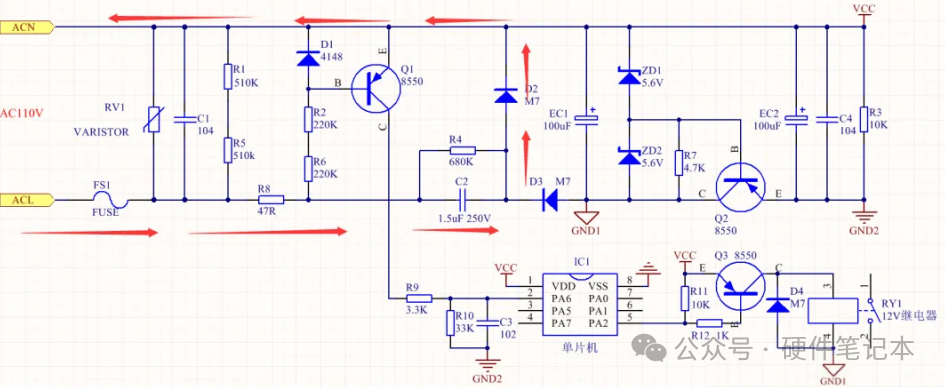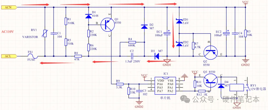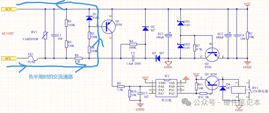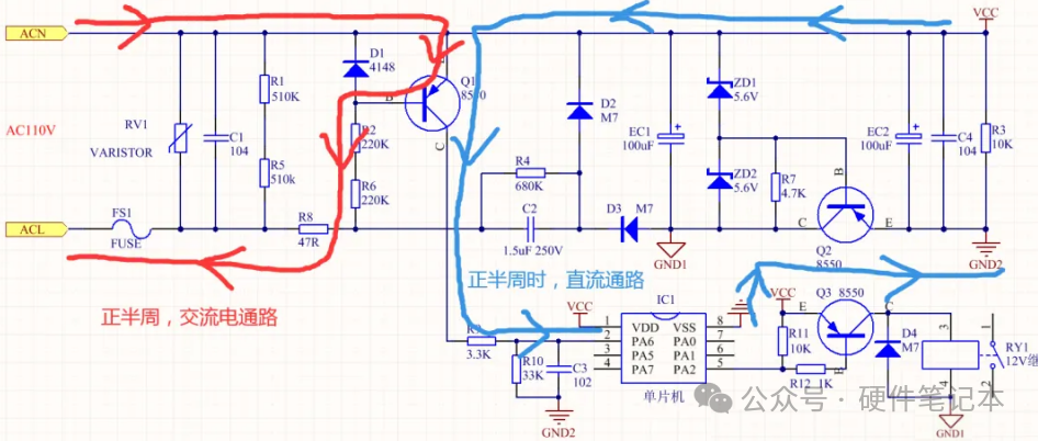 先说阻容降压部分,R8,C2,D2,D3,ZD1,ZD2构成常见阻容降压电路,交流电经过半波整流阻容降压后,在两个稳压管ZD1,ZD2两端形成11.2V左右的直流电压(这个电压是提供给后面的12V继电器使用的)。阻容降压电路交流电的正负半周的电流流向分别如下: