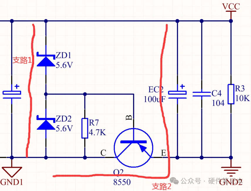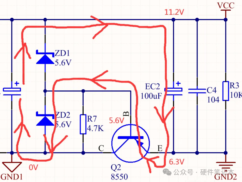 单片机系统供电为5V,Q2和ZD2组成5V稳压电路,Q2的发射极电压跟随基极电压,基极电压被钳位在5.6V。所以相对于GND1这个参考电位来说,Q2发射极电压为6.3V,因为Q2发射极的电压约为0.7V。我们知道ZD1,ZD2两端的电压为11.2V.根据原理图,稳压管ZD1,ZD2支路是和Q2、EC2这两个器件串联后的支路并联在一起的。