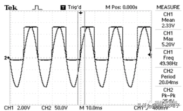 下面来讲讲过零检测电路,在该方案中,过零检测信号是用来给单片机计时用的,一般来说,只要过零检测电路滤波做的好,软件处理的好,计时精度还是能让人满意的。一般情况下会比单片机的内震计时精度要高。我们看电路,D1,R2,R6,Q1组成过零检测电路,交流电正半周时,Q1会导通,交流电的负半周时,Q1会截止。这样在单片机的PA6口就能检测到一个高低跳变的方波,在交流电经过零点的时刻,波形会跳变(波形如下),我们知道,电网频率是固定的,也就是说每个周期内交流电经过零点的次数是固定的,根据这个道理,计数一定时间内的过零点的数量就能准确的算出经过了多少周期,以上,单片机就是通过这个方法来计时的。