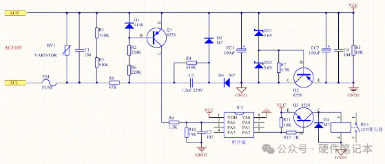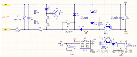 前几天收到一台客户提供的竞品机器,电路板方面客户希望我们抄板,目前这个电路板方案已经出货100K以上了,品质很稳定,客户希望我们照抄设计,仔细看了样机的电路板后,发现成本控制的很好,而且设计有点意思。以下是我抄板的图纸,截取部分原理图,欢迎大家来讨论分析下工作原理和各个部件的作用,以及为什么要这么设计?