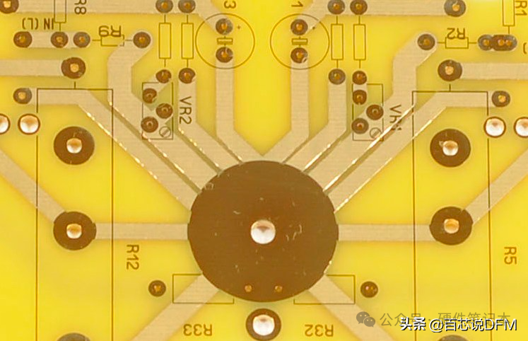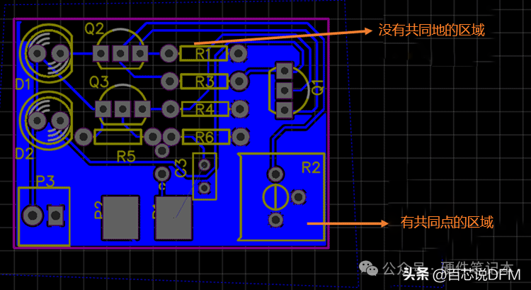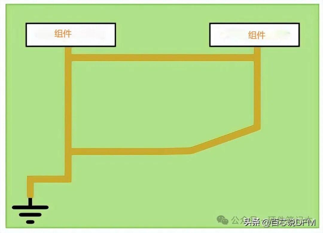 所有连接到地面的组件都通过公共迹线连接在一起,这在旧 PCB 和简单 PCB 中很常见。