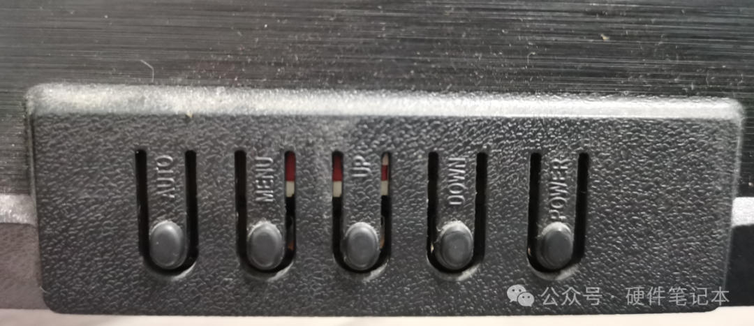 按键来个特写,按键是用活动的塑胶结构来代替的,可以节约少许成本。从左到右分别是AUTO(自动),MENU(菜单),UP(上),DOWN(下),POWER(电源开关机),一般显示屏都有这几个按键用来控制显示画面。