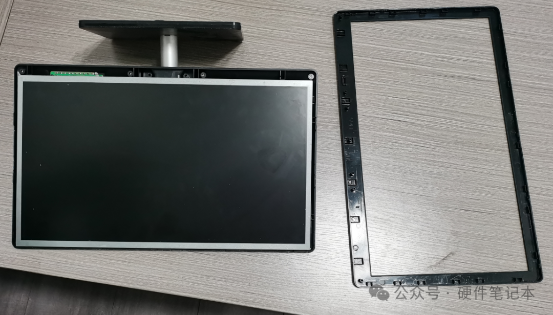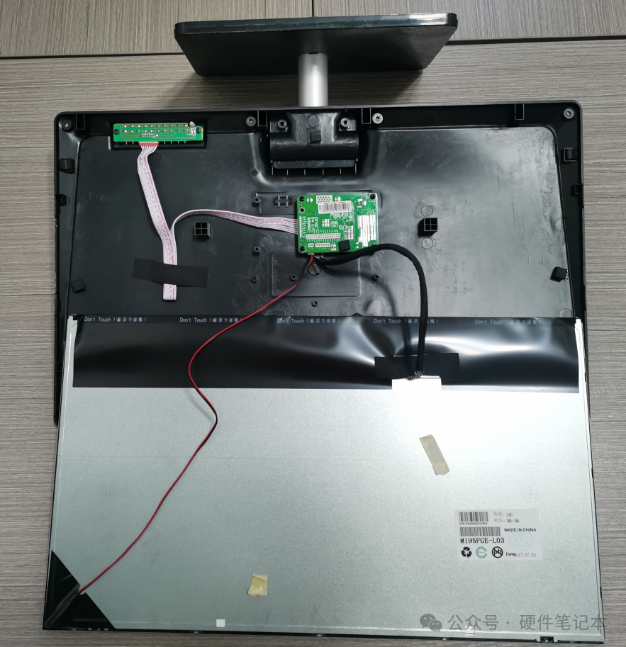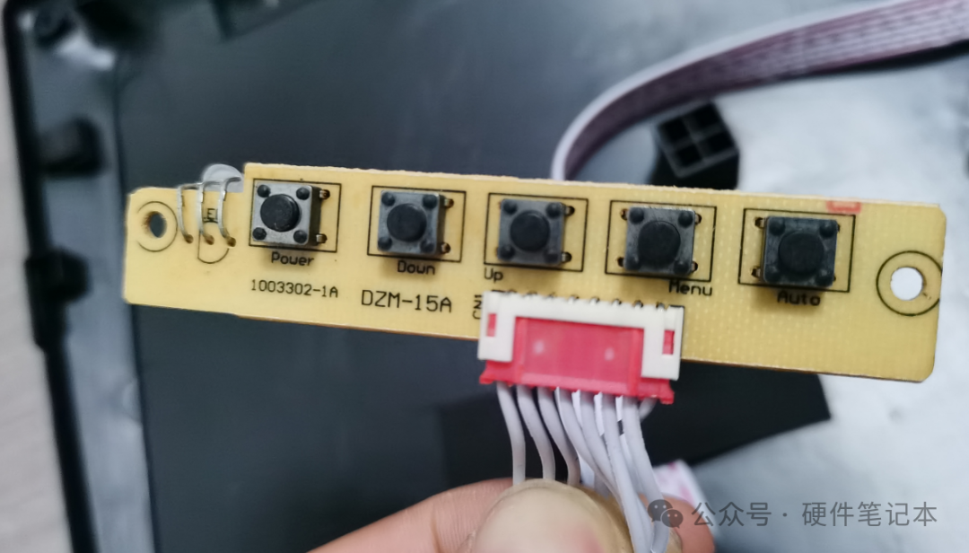 轻轻的将屏挪动,明显的可以看见中间的液晶屏幕驱动板,我们也叫AD板,左上角是按键板,一共有三根线,左上角是按键线,左下角是背光线,右边是屏线(一般是LVDS接口),总体看起来非常简单。