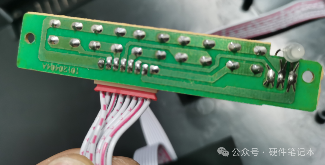 再看按键板,按键板是单面板,现在很少见到了,这个LED灯是直接弯过板子的,做工就很潦草。虽然只过一次波峰焊就好了,但灯还得单独把它扳弯。