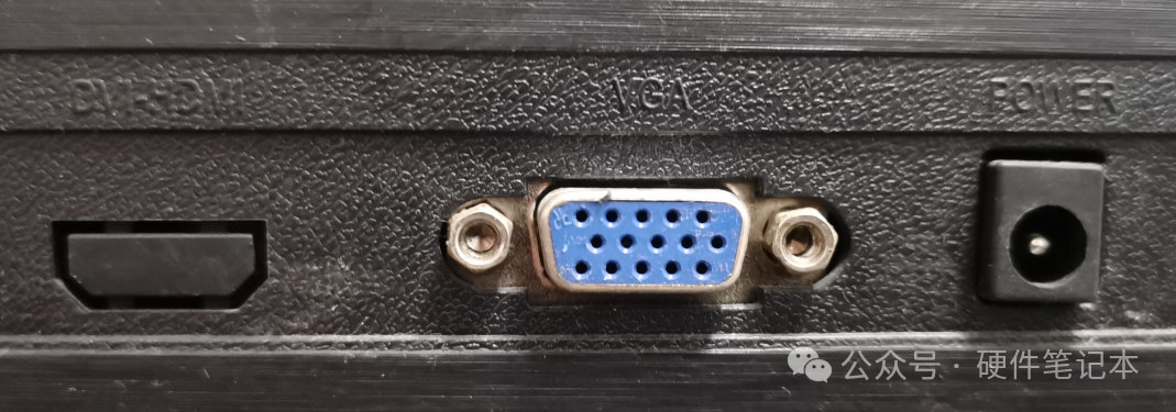 再看看显示接口,左边有被封住的、预留的DVI接口,中间是VGA接口,右边是POWER电源输入DC JACK 2.5mm。现在显示屏普遍用的都是HDMI接口,稍微好点的显示屏也有DP接口等等。