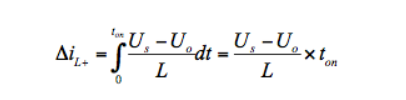 首先是在导通期间,这时候的电感的电压大小是Uin-Uo,电感的电流会从最小值上升到最大值(这里的最小值一定是大于0),即ILmin->ILmax。所以在导通期间电感的增量就为
