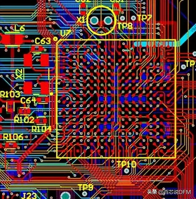 较粗的走线已针对载流能力进行了优化,并用于需要更高功率的外围设备或与电源相关的功能,例如风扇、电机和向较低级别组件的一般功率传输。图中左上角甚至还显示了一个差分信号(USB 高速),其中定义了特定的间距和宽度,以满足 90 Ω的阻抗要求。下图显示了一个稍微密集的 6 层电路板和一个需要更细走线的 BGA(球栅阵列)组件。