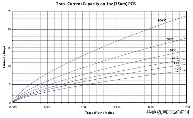 下图显示了几种走线宽度和相应的电流值,这些值将在 1 盎司/平方英尺的铜重量下将温度上升限制在 10 °C。
