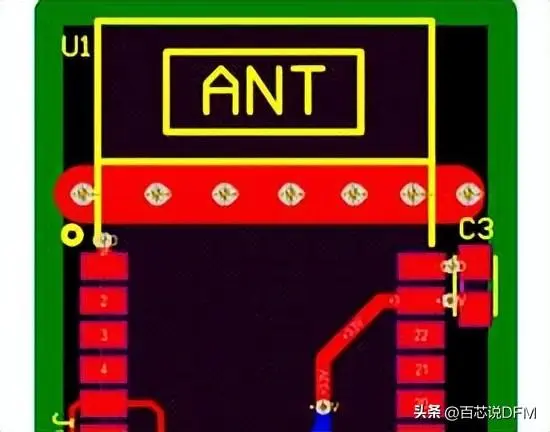 下图显示了一个靠近电路板边缘放置的蓝牙模块示例,其天线(通过丝印“ANT”标记)位于包含连接到接地层的嵌入式通孔的粗迹线外部。这有助于将天线与其他板载电路和平面隔离。