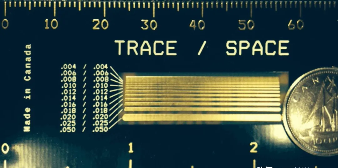 所以在设计中,我们只能控制走线的宽度。对于大多数制造商,最小走线宽度为6mil 或 0.152mm,主要是因为蚀刻工艺和目标产量有限制,