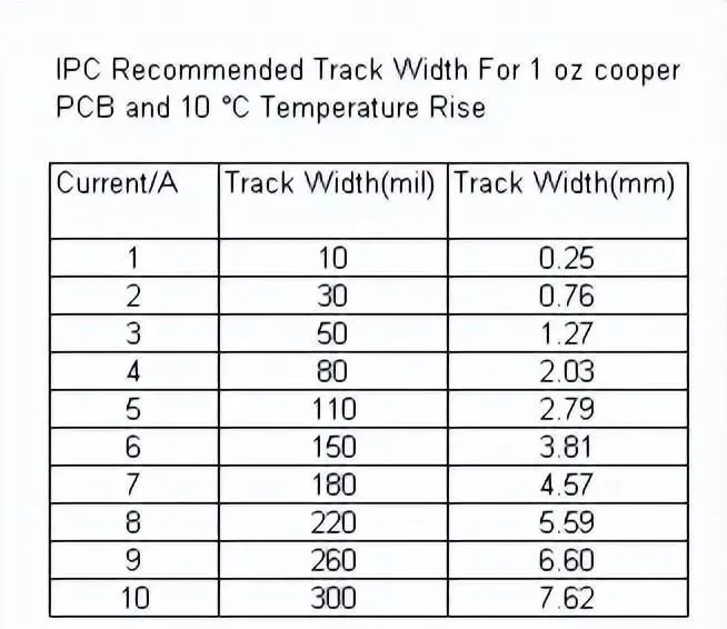 PCB 走线宽度表可以帮助你确定 PCB 的走线宽度,还可以让你了解载流能力和温升的影响,可以参考下表。