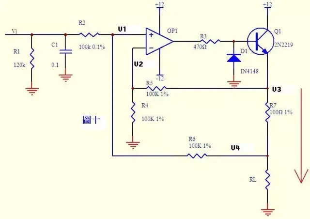 电流可以转换成电压,电压也可以转换成电流。图十就是这样一个电路。上图的负反馈没有通过电阻直接反馈,而是串联了三极管Q1的发射结,大家可不要以为是一个比较器就是了。只要是放大电路,虚短虚断的规律仍然是符合的!