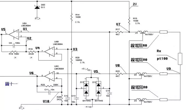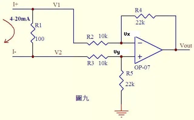 分析一个大家接触得较多的电路。很多控制器接受来自各种检测仪表的0~20mA或4~20mA电流,电路将此电流转换成电压后再送ADC转换成数字信号,图九就是这样一个典型电路。如图4~20mA电流流过采样100Ω电阻R1,在R1上会产生0.4~2V的电压差。由虚断知,运放输入端没有电流流过,则流过R3和R5的电流相等,流过R2和R4的电流相等。故: