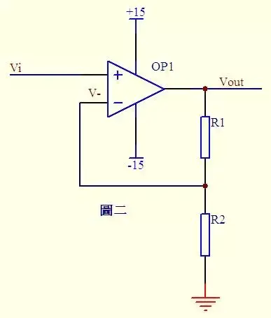 由abc式得Vout=Vi*(R1+R2)/R2这就是传说中的同向放大器的公式了。