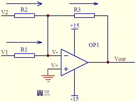 代入a式,b式变为V1/R1+V2/R2=Vout/R3如果取R1=R2=R3,则上式变为-Vout=V1+V2,这就是传说中的加法器了。