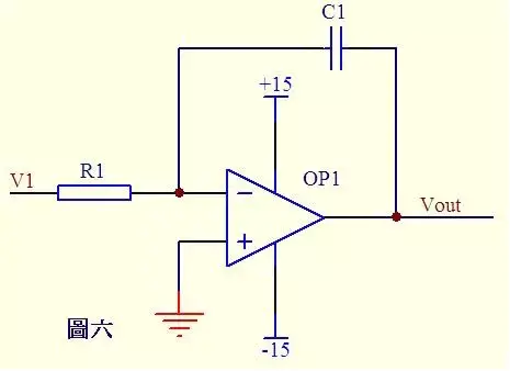 若V1为恒定电压U,则上式变换为Vout=-U*t/(R1*C1)t是时间,则Vout输出电压是一条从0至负电源电压按时间变化的直线。
