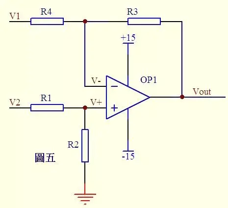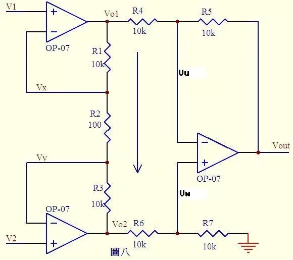 由dh得Vout=(Vy–Vx)(R1+R2+R3)/R2上式中(R1+R2+R3)/R2是定值,此值确定了差值(Vy–Vx)的放大倍数。