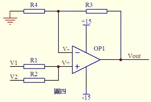 请看图四。因为虚断,运放同向端没有电流流过,则流过R1和R2的电流相等,同理流过R4和R3的电流也相等。