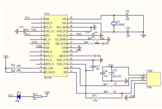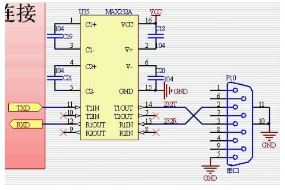 若是芯片与PC机(或上位机)相连,除了共地之外,就不能这样直接交叉连接了。尽管PC机和芯片都有TXD和RXD引脚,但是通常PC机(或上位机)通常使用的都是RS232接口(通常为DB9封装),因此不能直接交叉连接。RS232接口是9针(或引脚),通常是TxD和RxD经过电平转换得到的。故,要想使得芯片与PC机的RS232接口直接通信,需要也将芯片的输入输出端口也电平转换成RS232类型,再交叉连接。