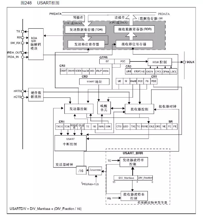 框图的上部分,数据从RX进入到接收移位寄存器,后进入到接收数据寄存器,最终供CPU或者DMA来进行读取;数据从CPU或者DMA传递过来,进入发送数据寄存器,后进入发送移位寄存器,最终通过TX发送出去。