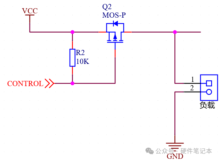 当 CONTROL 为0时,Q3关断,Q2的G极电平被拉高为VCC,Q2 - PMOS关断,负载停机。