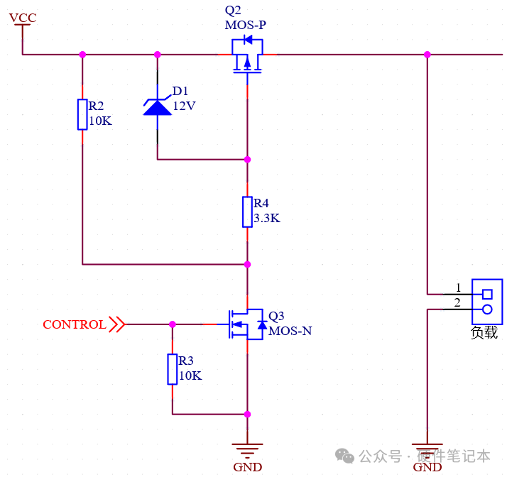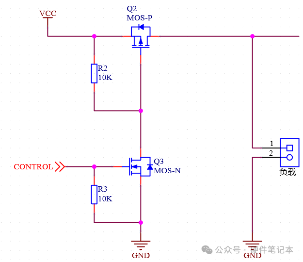 当CONTROL 为1,Q3开通,Q2的G极电平被拉低为0,Q2 Vgs<导通阀值,PMOS开通,负载工作。