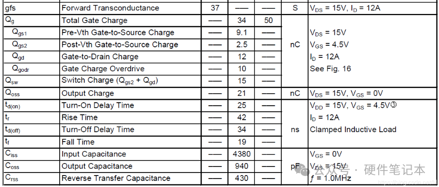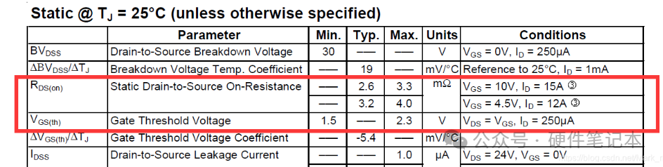 下图为 IRLR7843 - NMOS 数据手册的部分内容。
